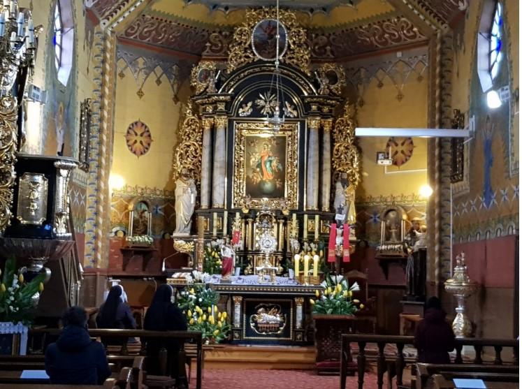 W Rymanowie stanęliśmy też pod kościołem, ale weszliśmy tam tylko na chwilę, bo widok wnętrza otwartego dla wiernych był naprawdę przygnębiający: najdelikatniej mówiąc – tłoku w nim nie było. Przed wieloma laty, gdy go zwiedzałem ze dwa razy, wyglądało to zupełnie inaczej nawet w zwyczajny dzień, a nie sobotni…