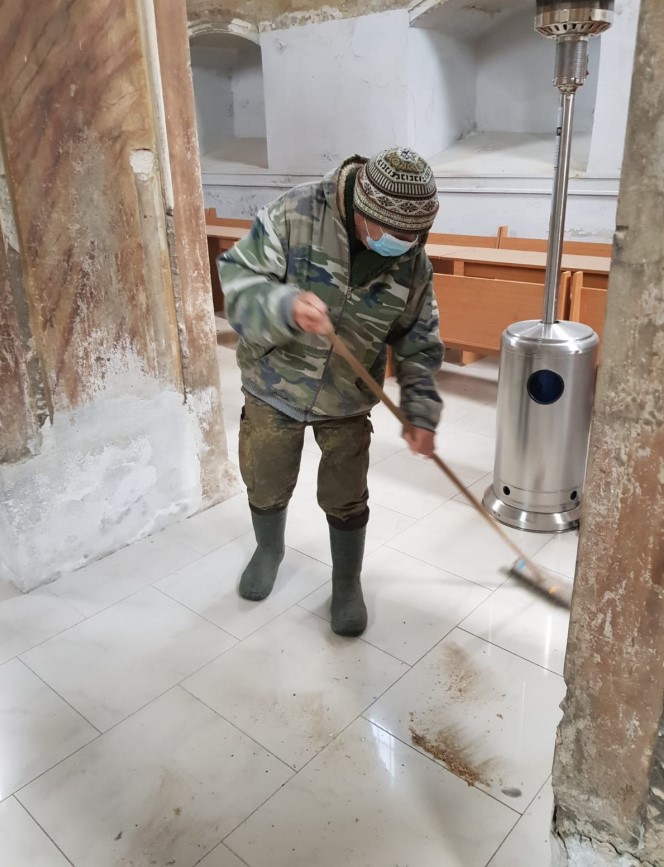 Opowiedziałem to panu Markowi, dodając, że w normalnych czasach można było synagogę zwiedzić. Pan Marek spojrzał na lekko uchyloną furtkę i zadzwonił na podany na niej numer telefonu. Okazało się, że w środku był opiekun synagogi i przewodnik po niej. Zapytał, czy jesteśmy w maseczkach i po kilku minutach wpuścił nas do wnętrza. Miał zamiar pół godziny wcześniej odjechać do Krosna, ale trzeba było zabrać się za sprzątanie, bo jakieś ptaki zabrudziły całą posadzkę odchodami i tym, z czego pod wysokim sklepieniem budowały gniazda. Wyręczyłem go w sprzątaniu, co zostało przez pana Marka utrwalone dla potomności, a on opowiadał o losie synagogi, cadykach, chasydach itp. Kiedy skończył (miał na twarzy czarną maseczkę jak Zorro), zapytałem: