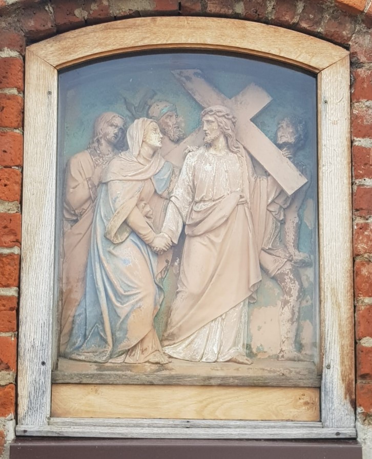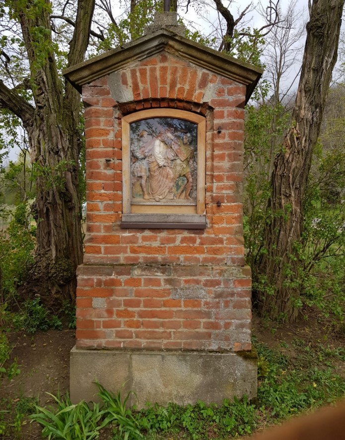 Rzeczywiście kaplica Grobu Pańskiego, wybudowana na Górze Kalwarii w I połowie XVIII wieku jako wotum dziękczynne za powrót do zdrowia wojewody Ossolińskiego, zniszczona w 1944 roku podczas walk o wyzwolenie miasta i odbudowana w 1981 roku dzięki staraniom, wspominanego przez panią Halinę z prawdziwą atencją, ks.Franciszka Mroza, a później obita przez jego następcę białym sidingiem, woła o pomstę do nieba. Dlatego pan Marek ani razu nie skierował obiektywu komórki w jej stronę. Kierował ją za to w kierunku wymurowanych z cegieł za czasów hr. Potockiej stacji Drogi Krzyżowej, które też uległy zniszczeniu podczas działań wojennych roku 1944. Chyba nie wszystkie i nie całkowicie, ale zbyt krótko mieszkam w tych stronach, żeby udokumentować to nawet słowem. Zostały chyba nie odbudowane jak kaplica, lecz odrestaurowane dzięki staraniom ks. Franciszka Mroza. Pan Marek zauważył na pierwszy rzut oka, że przynajmniej dwie z tych stacji zachowały się w stanie nienaruszonym – płaskorzeźby ze scenami Męki Pańskiej, wykonane w 1876 roku w Zakładzie Meyera w Monachium, zdecydowanie wyróżniają się od drewnianych podróbek zabytkowych płaskorzeźb wykonanych współcześnie. Te oryginalne kosztowały widocznie sporo pieniędzy, skoro Pani na Rymanowie, hr. Anna Zofia z Działyńskich Potocka, wciąż utyskiwała w swoich pamiętnikach na brak pieniędzy na wykupienie kolejnych płaskorzeźb z zakładu monachijskiego do dwunastu stacji Drogi Krzyżowej. A poniżej to, co ocalało z zawieruchy wojennej: